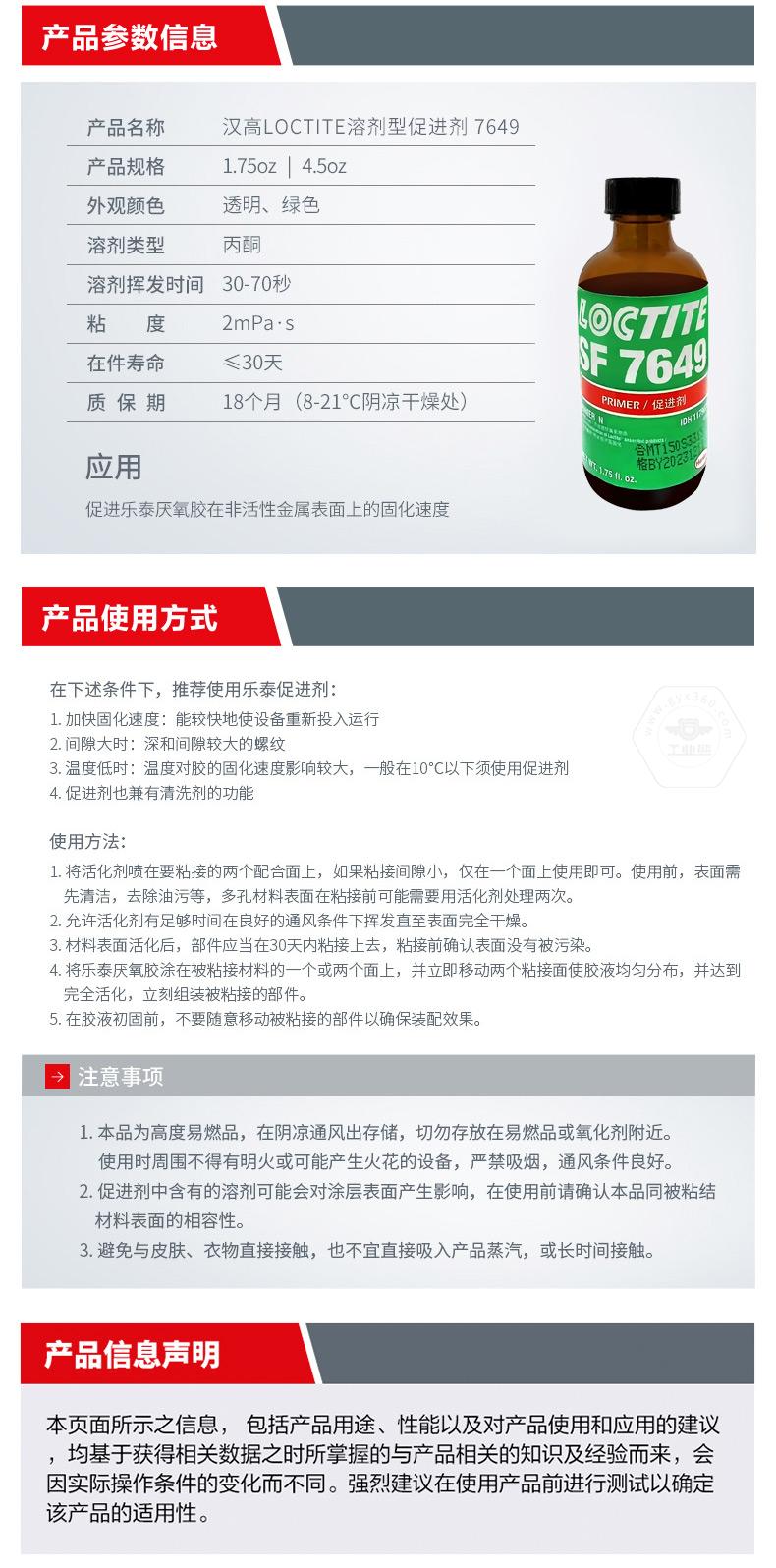 樂泰SF7649是一款用于表面處理、促進固化的溶劑型促進劑。樂泰SF7649適用于惰性金屬表面,可促進樂泰厭氧膠在非活性金屬表面的固化速度,并兼顧大間隙填充需求。對于需要加快固化速度、間隙較大,或一般在10℃以下使用促進劑的場景,樂泰SF7649更有針對性。樂泰SF7649規(guī)格為1.75oz和4.5oz,外觀為透明、綠色,溶劑類型為丙酮,溶劑揮發(fā)時間30-70秒,粘度2mPa·s,在件壽命≤30天,質(zhì)保期18個月(8-21℃陰涼干燥處)。